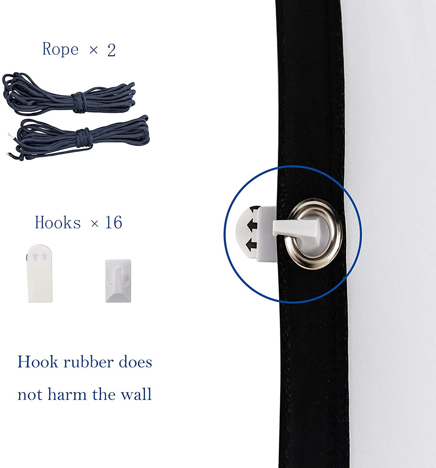 - Package contents: 1 x projector screen, 16 x hooks, 16 x hook tapes, 2 x ropes, 1 x storage bag.Please feel free to contact us at any time if you have any questions.