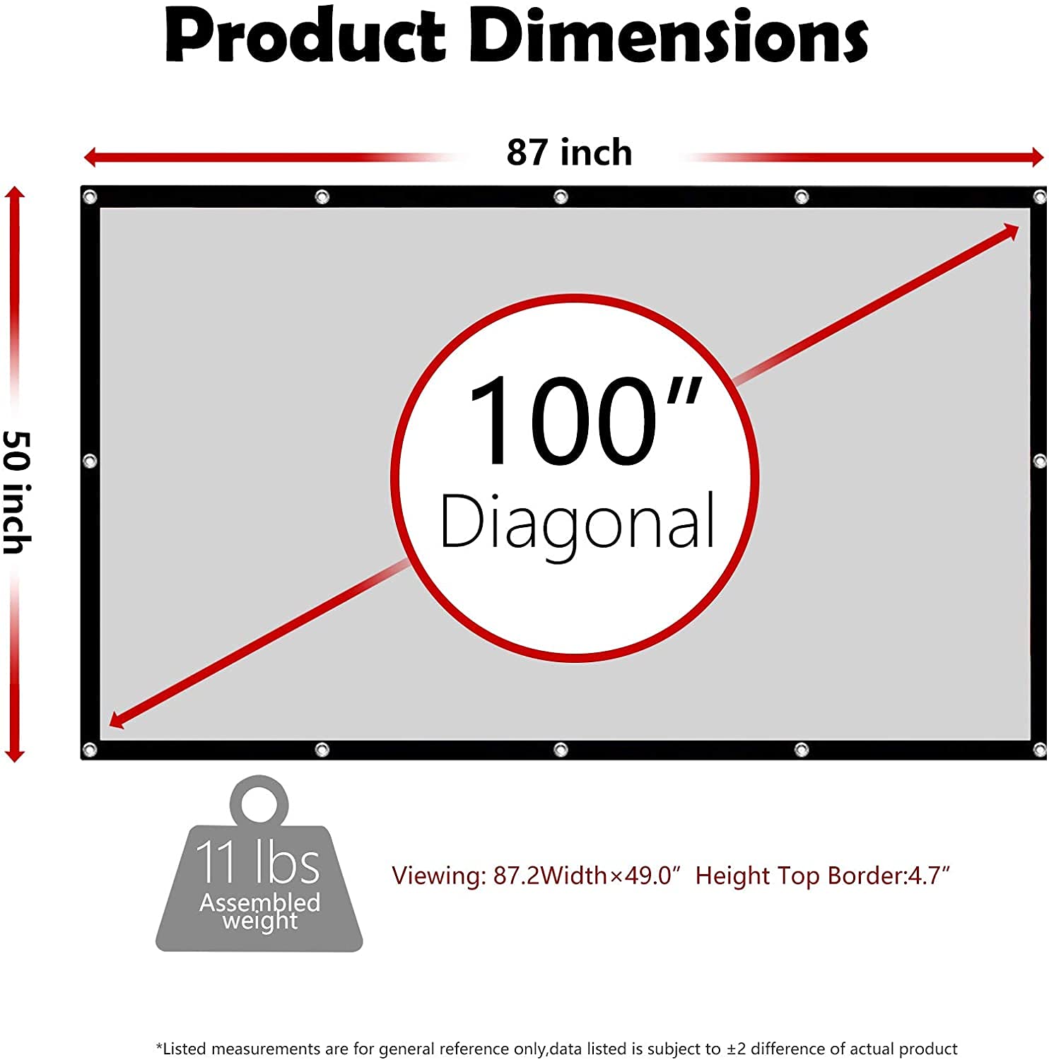 - The 100 inch Portable projection screen,16:9 format and diagonal 100'' offers 89-2/5'' x 52'' viewing area, packaged in folded professionally and package size is 14x 11x 1.2 inch portable for outdoor and camp.Our movie screen is lightweight and portable, convenient to storage and carry,you can fold the screen in small size and put it in your backpack or suitcase to take it wherever you want.