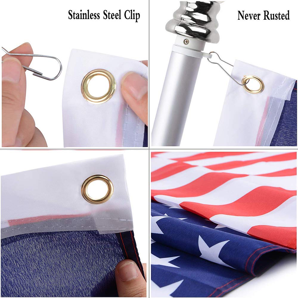 - 6FT aluminum flag poles diameter 1", 3x5 flag, free bracket, stainless steel clips, rings, Silver ball topper, mounting hardware and user guide.