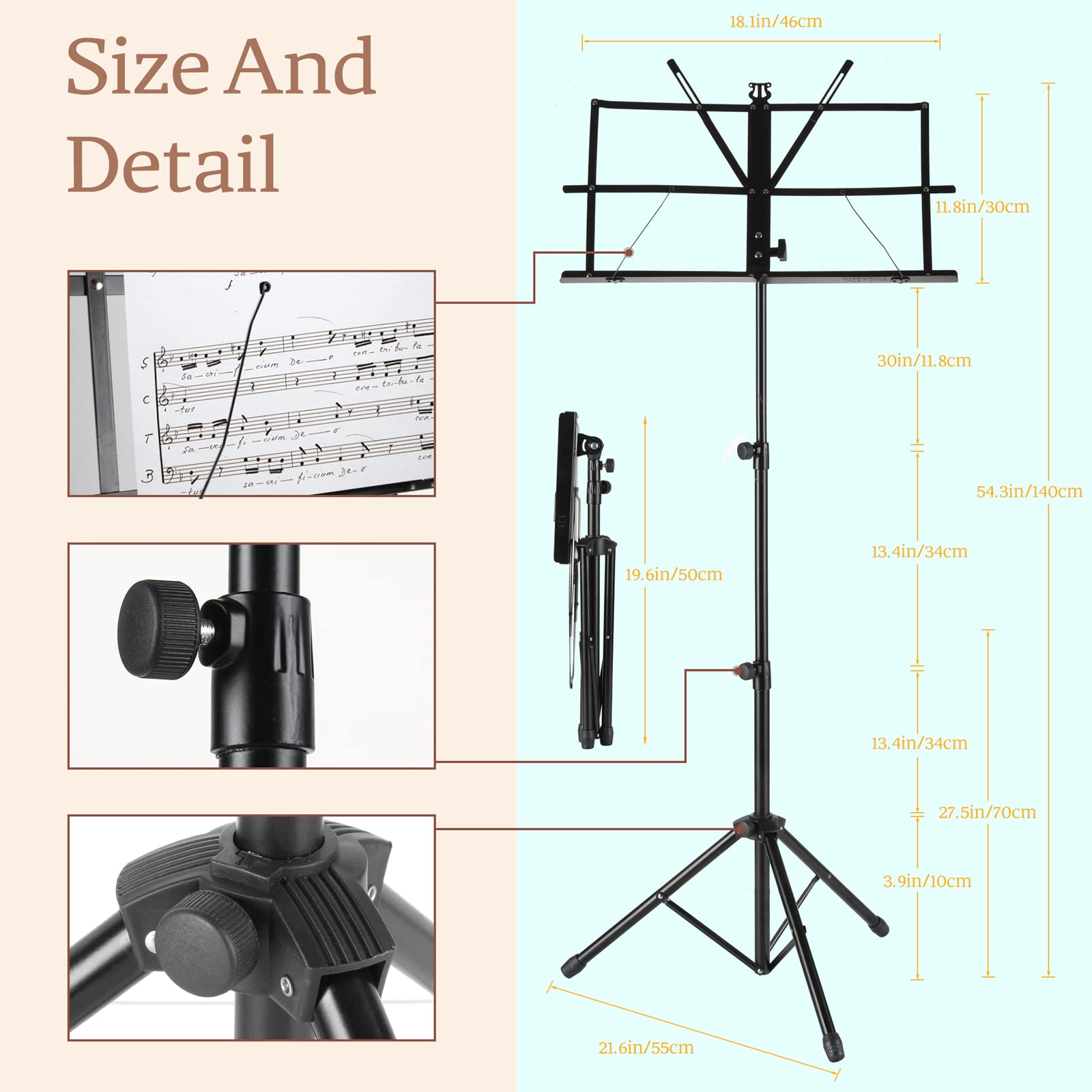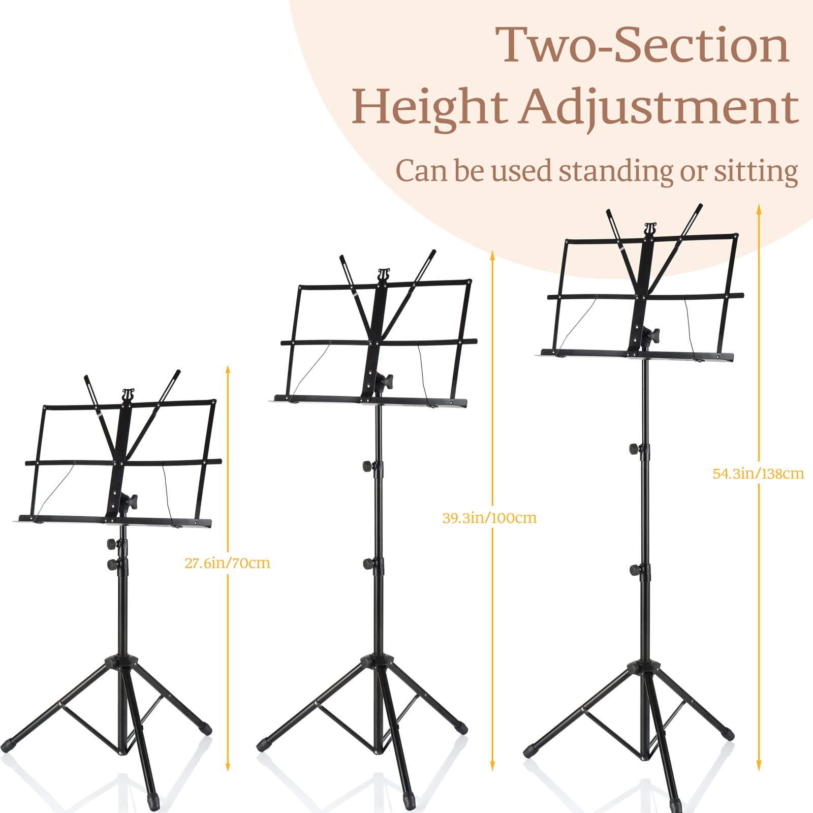 - ♬♬FLEXIBLE AND ADJUSTABLE - The Music Stand features flexible well-built knobs enabling you to easily adjust the height from 46CM to 115CM for your needs.Music Plate size: 29.25cmx46cm big enough for your sheets/books.This stand perfect for sitting or standing, and the vented tray, tall, wide, and deep enough to hold any kind of music sheet or books.