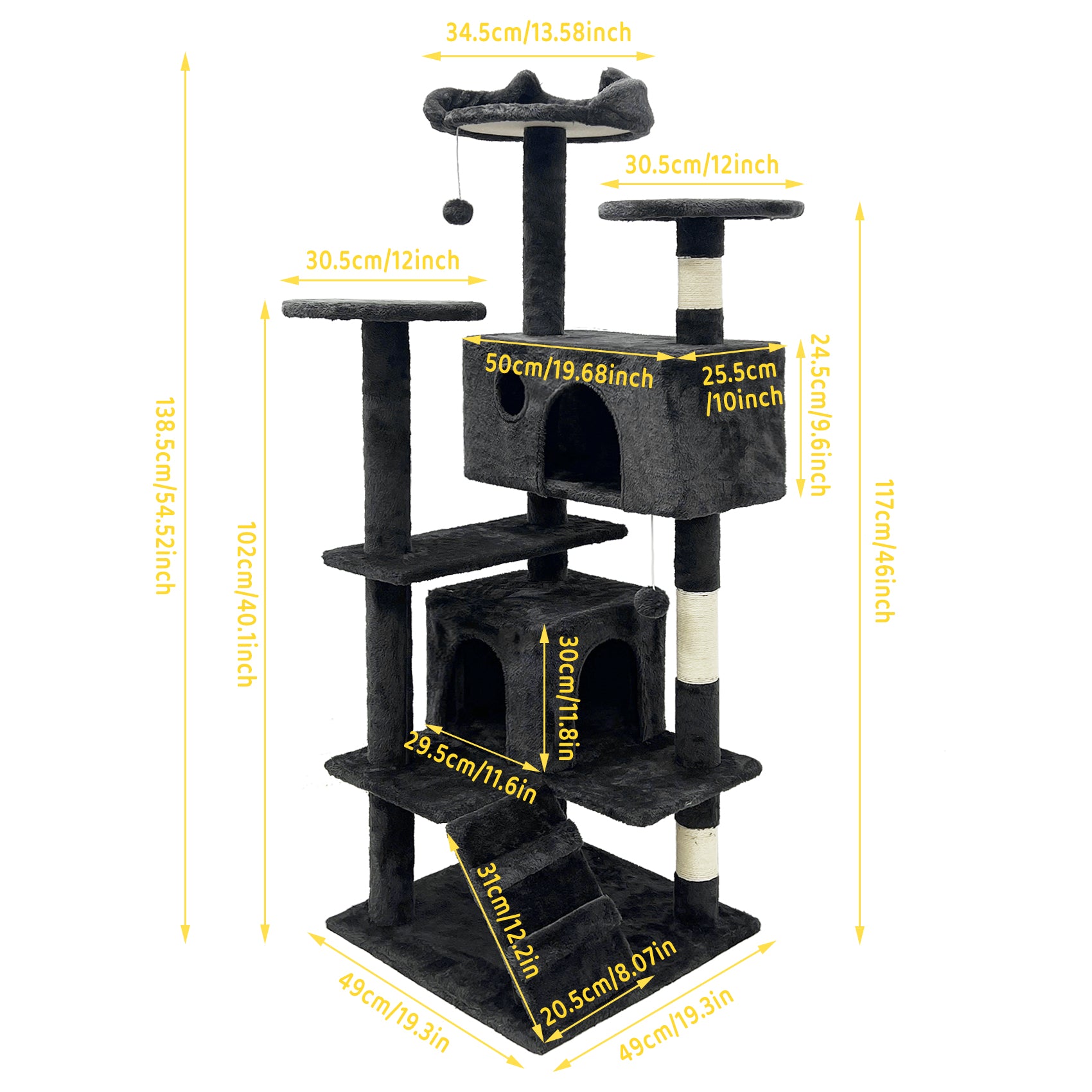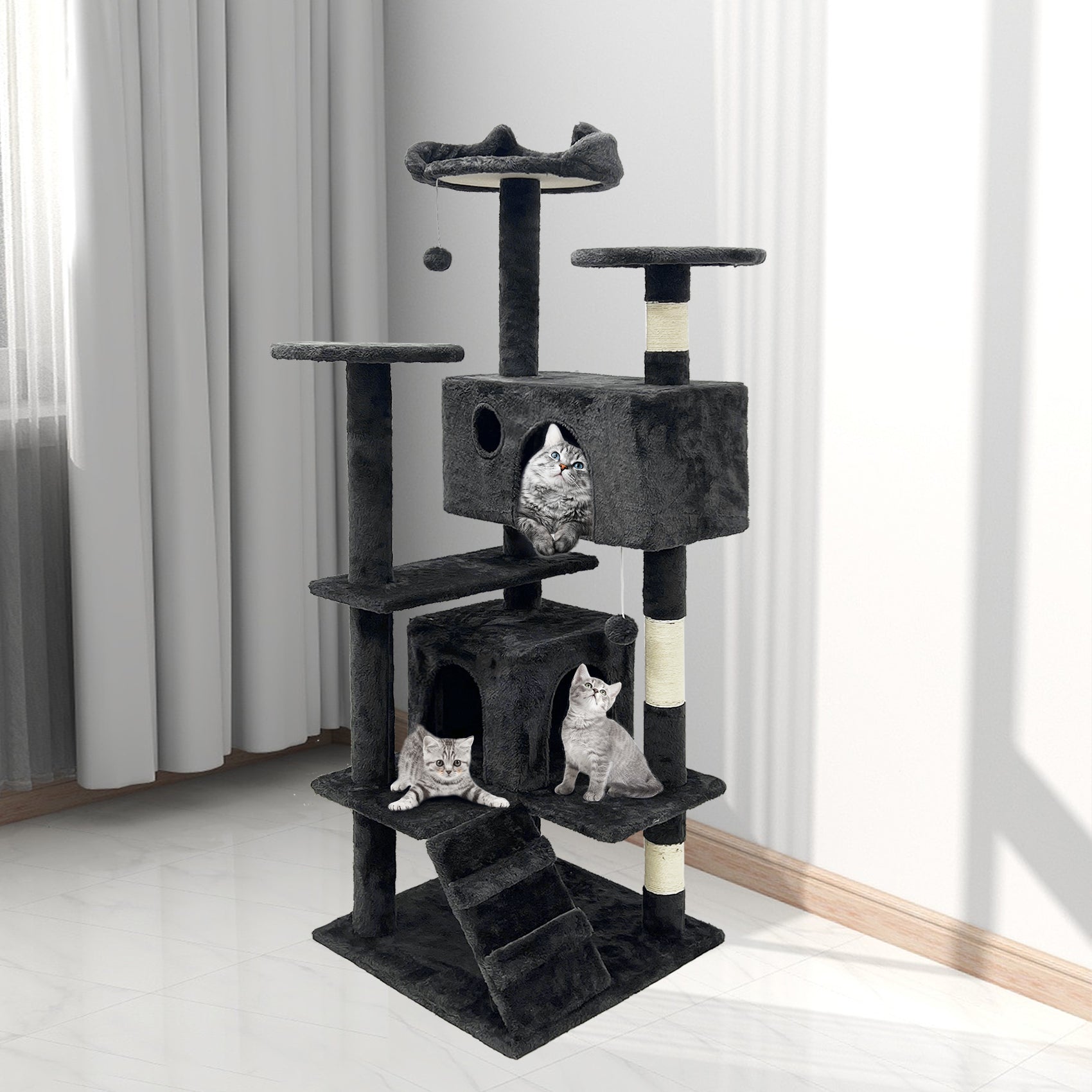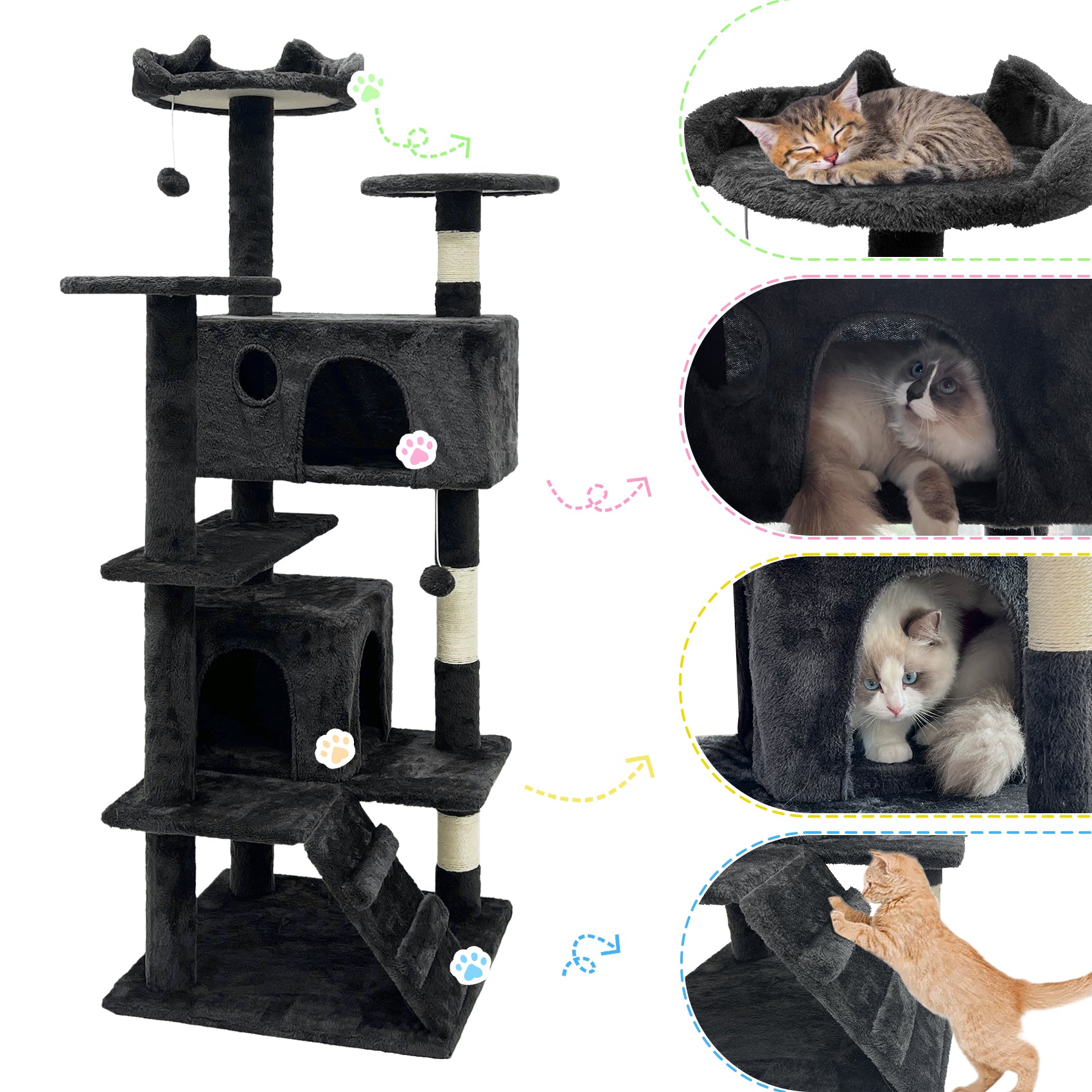 GRANDMA SHARK Cat Tree 138.5 cm - Multi-Level Cat Scratching Tower with Scratching Posts, 2 Houses, Ladder, and Dangling Balls, Black