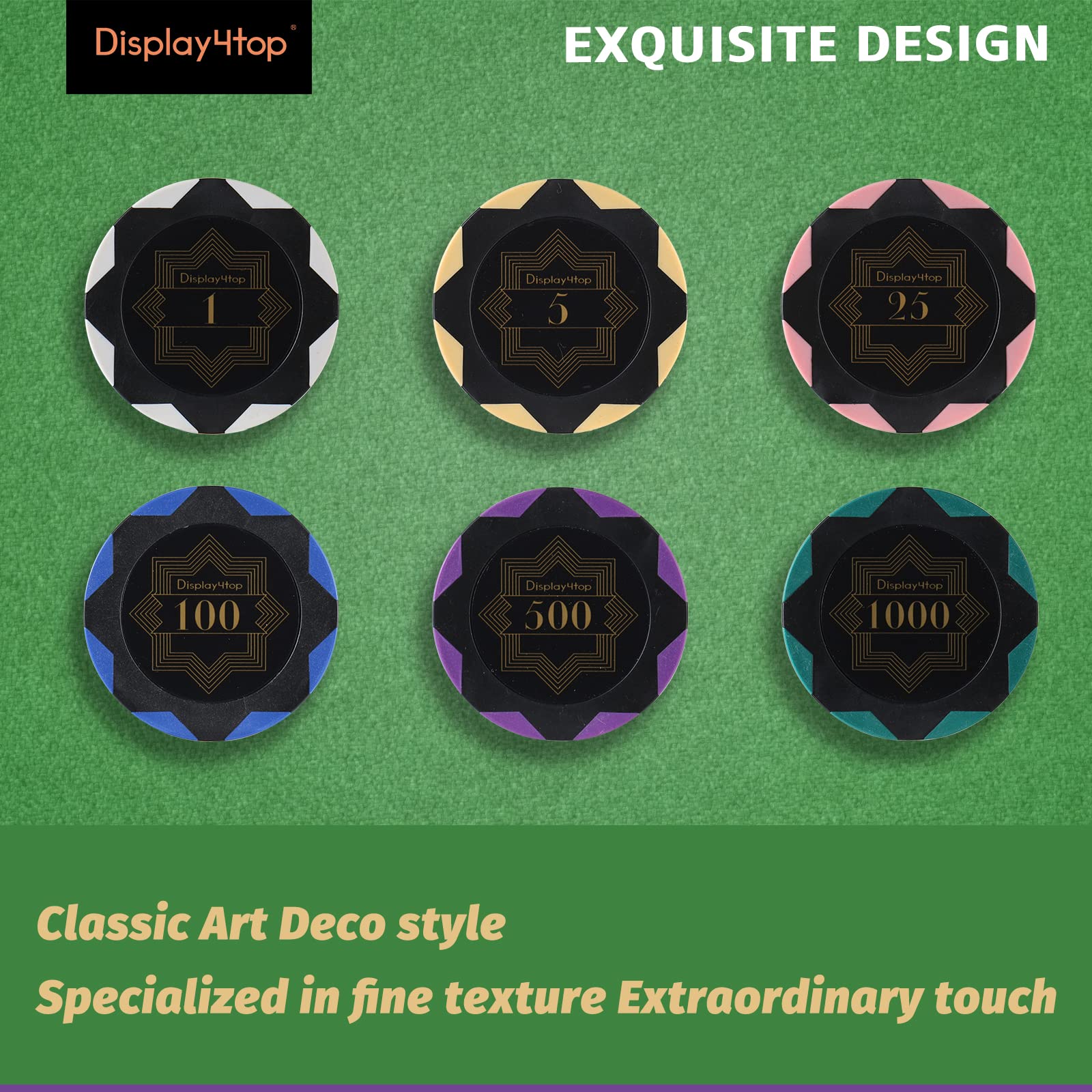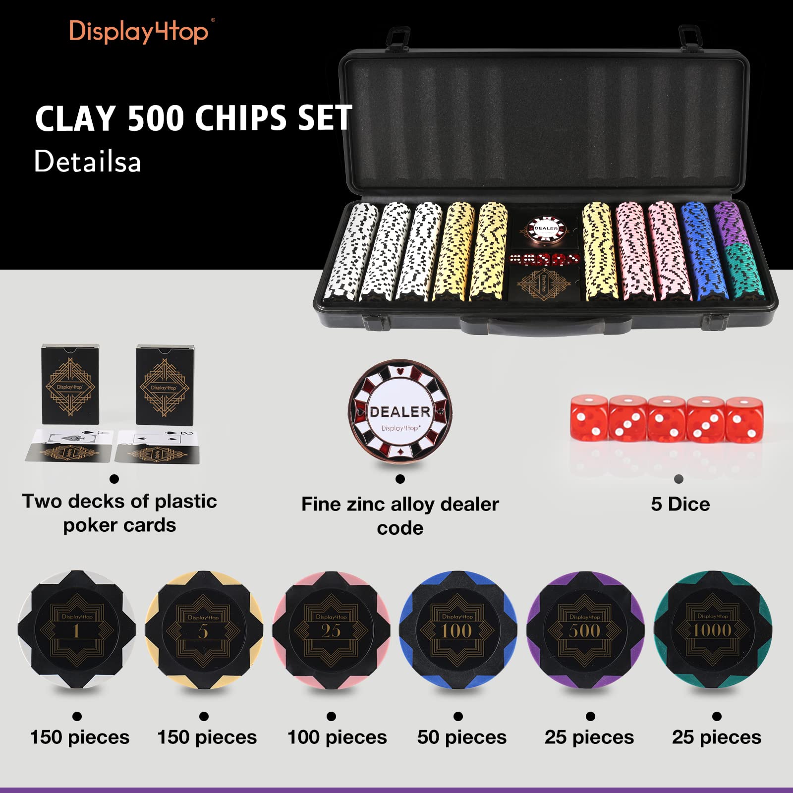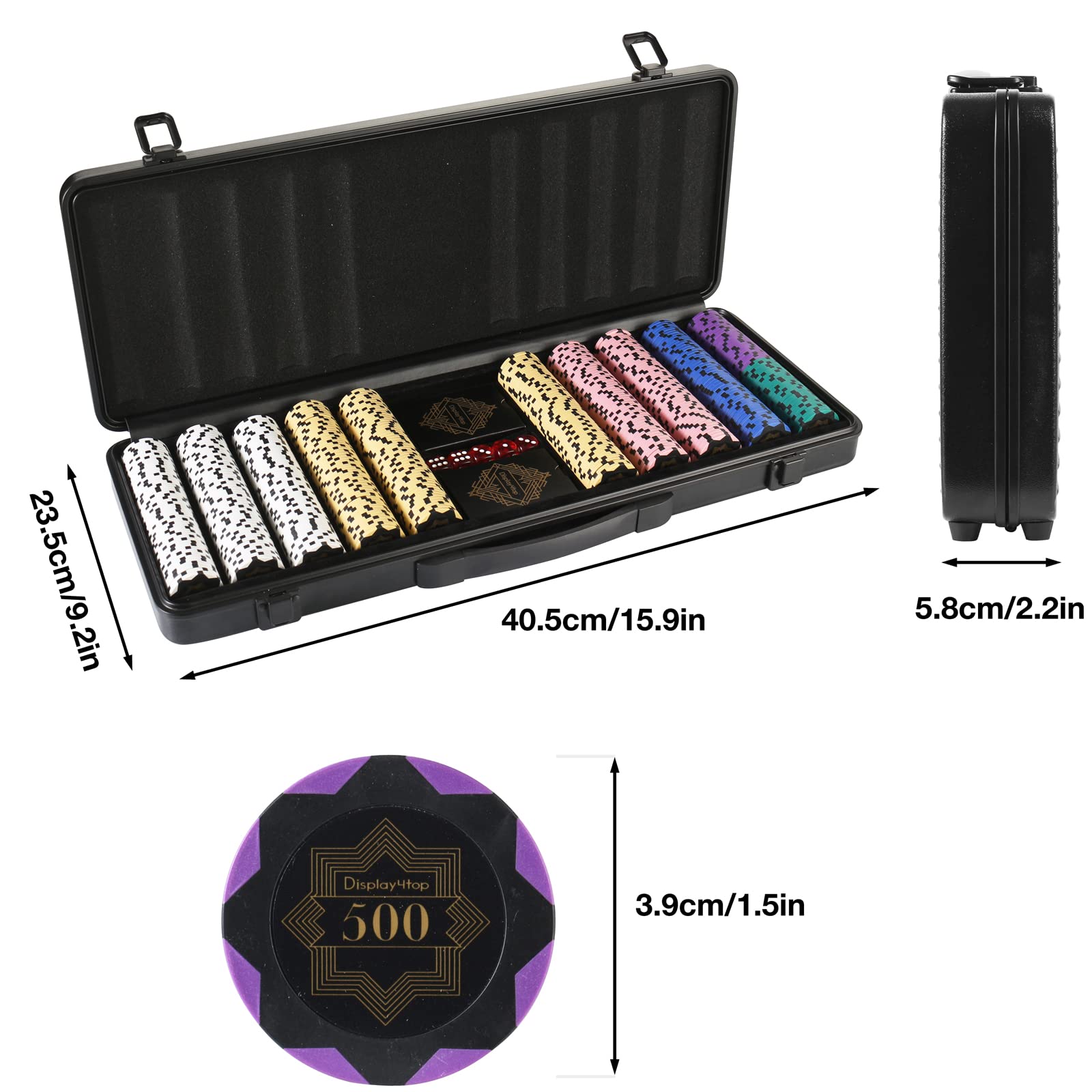- Display4top 13.5g Clay Poker Chips Set for Texas Holdem,Poker Chips with Denominations,Features a high-end Carrying case with Leather Interior Design and German Polycarbonate Shell