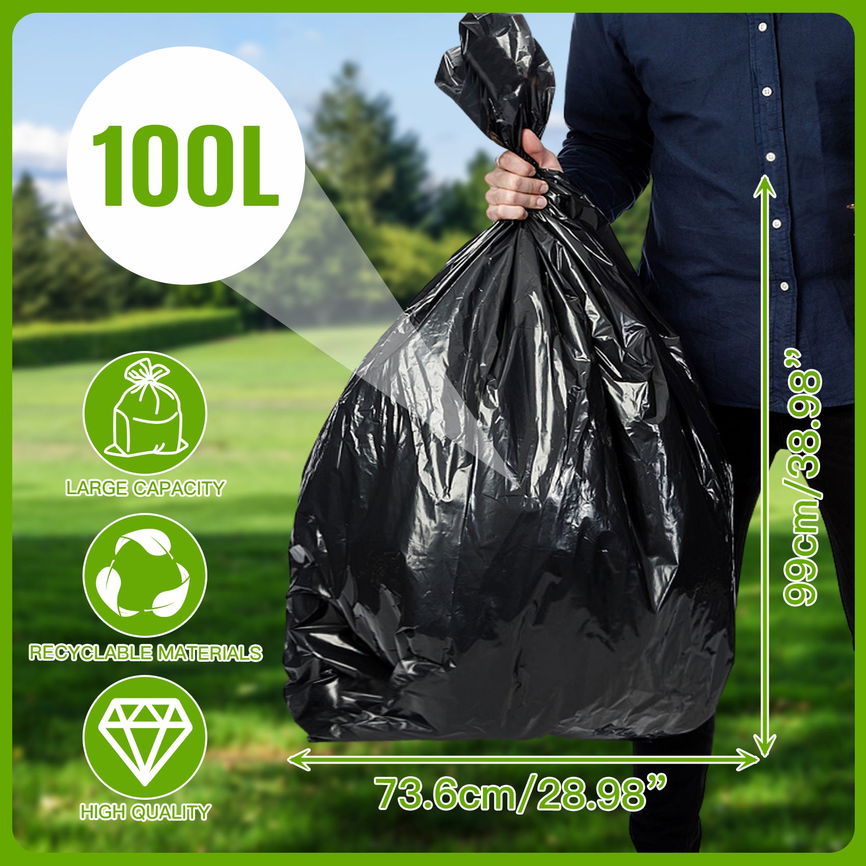 - Premium Quality: Our 100 litre garbage bags are crafted from a minimum of 98% recycled plastic, making them an environmentally conscious choice. The 33-micron thickness ensures durability and strength, capable of handling heavy and bulky waste without tearing or puncturing