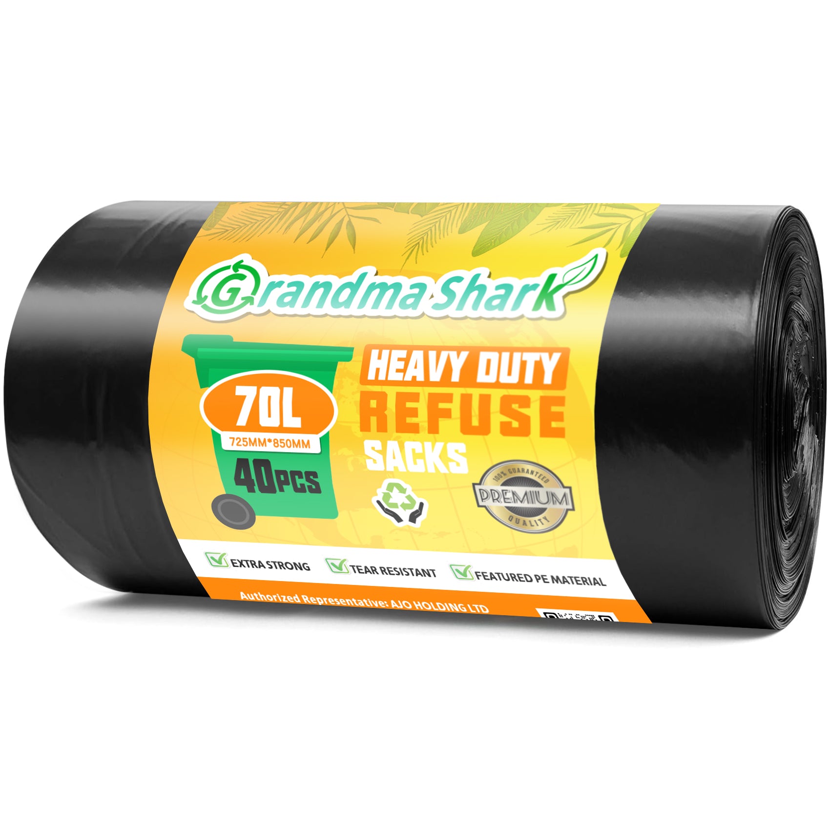 GRANDMA SHARK 70L Heavy Duty Bin Bags, Recycled Material Refuse Sacks, Strong 25 Micron Black Bin Bags, 40 Pack for Home & Commercial Waste Disposal, Durable & Leak-Proof