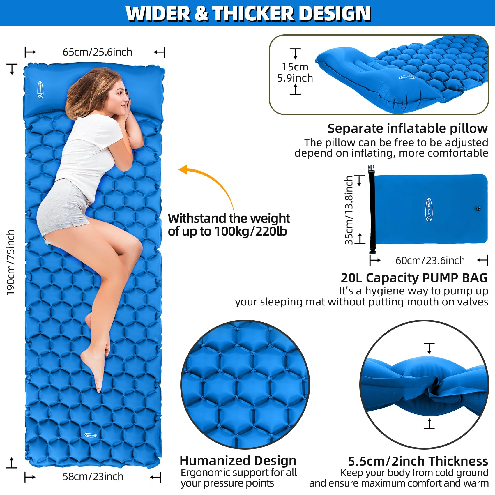 Inflatable Camping Mat, Ultralight Sleeping Mat with Pillow and 20L Pump Sack, Waterproof Air Mattress Single Pad Bed for Outdoor Backpacking Hiking Beach