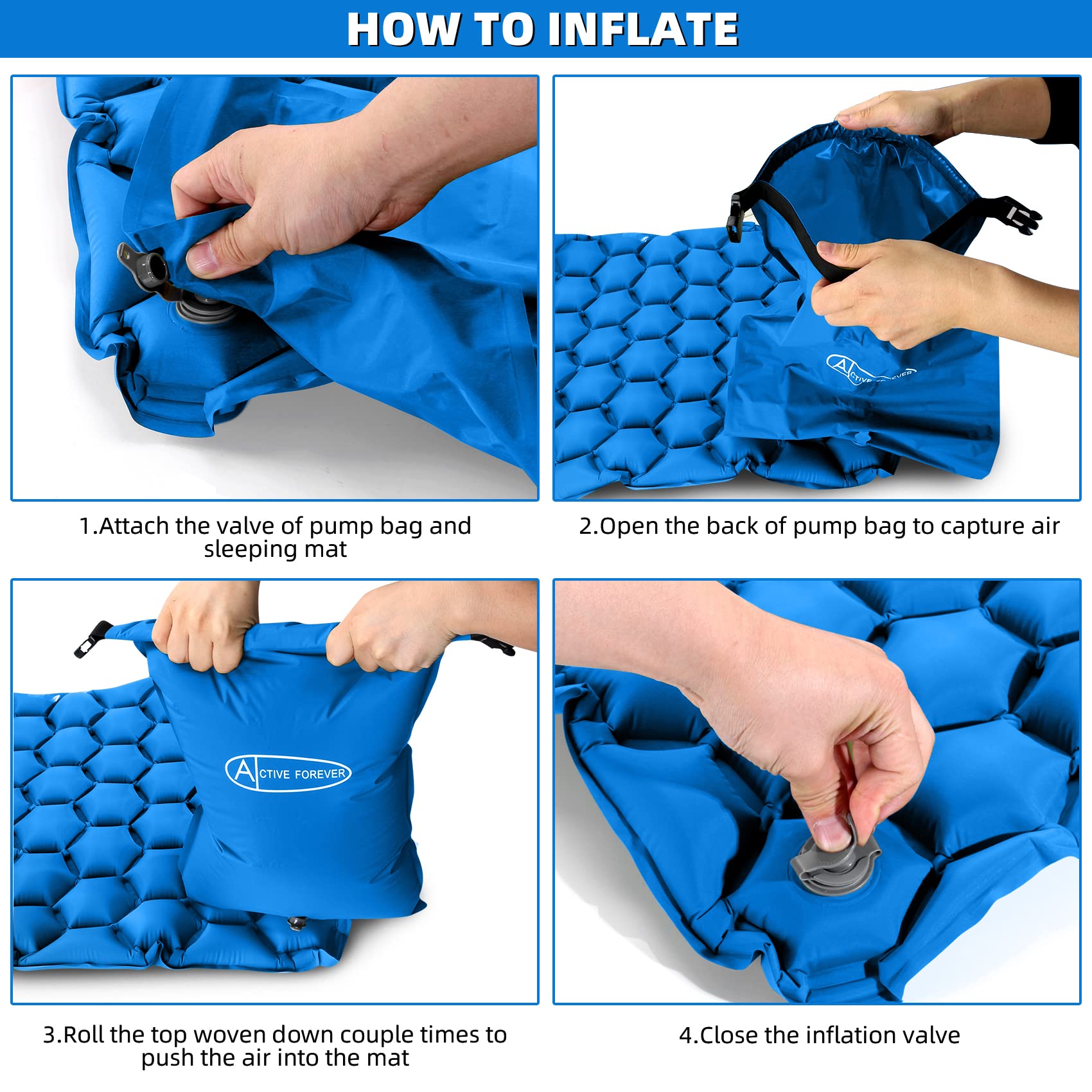 - 【20L Pump Sack to Inflate】- This inflatable camping mat does not require you to purchase a pump or inflate with your mouth. It just only takes 60s after you inflate the sleeping mat fully by the complimentary pump sack. HOW TO USE: 1. Connect the valve of pump sack and sleeping mat; 2.Capture air and roll the top woven down to push into the mat; 3.Repeat for several times until your desired firmness; 4. Remove the pump sack and close the inflation valve tightly.