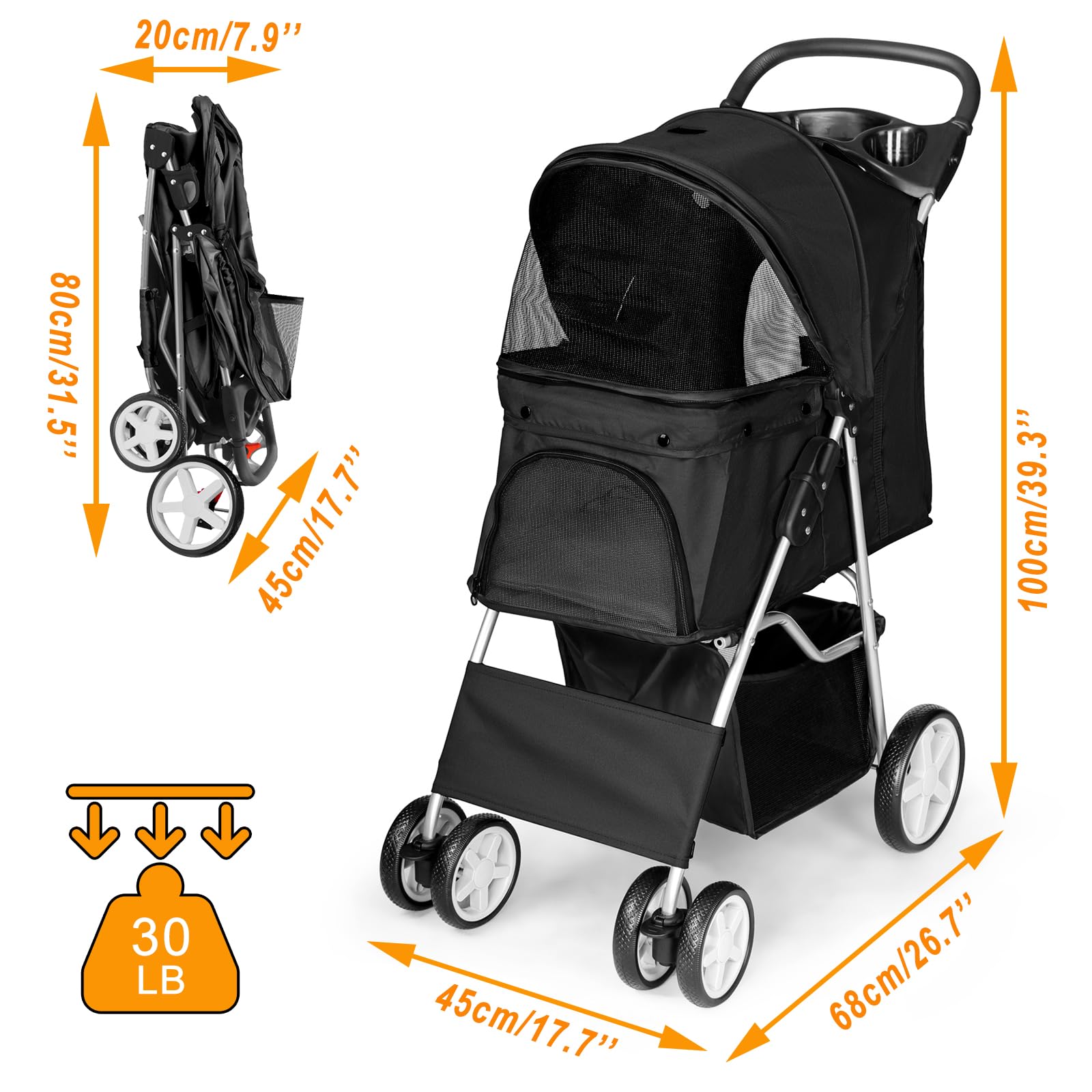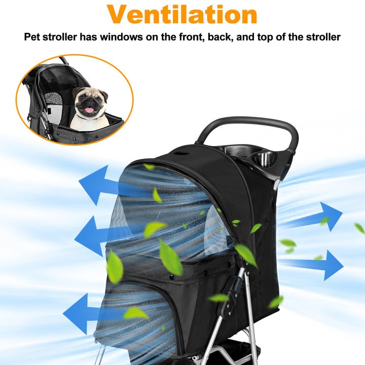 - [Large Capacity] - This pet stroller is capable of holding pets weighing up to 30 lbs.Mesh Windows provide plenty of visibility and ventilation for the pet riding in it. This dog stroller have plenty of room and ventilation, your pet can have a great view and get plenty of fresh air when you take your dog go to travel.