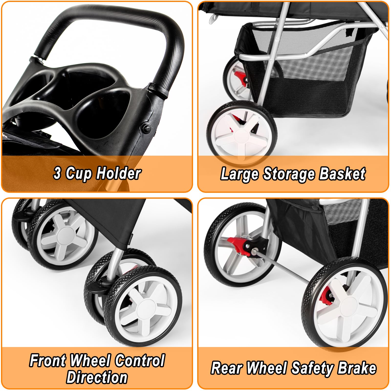 - [Convenient storage design] - Top section has a small window, a cup holder, and a canopy which can be easily opened.The pet stroller have a wonderful cup holder for you and a storage compartment underneath the dog stroller for toys, treats, and water bottles, etc.So there is enough storage space when you travel, shopping or strolling.