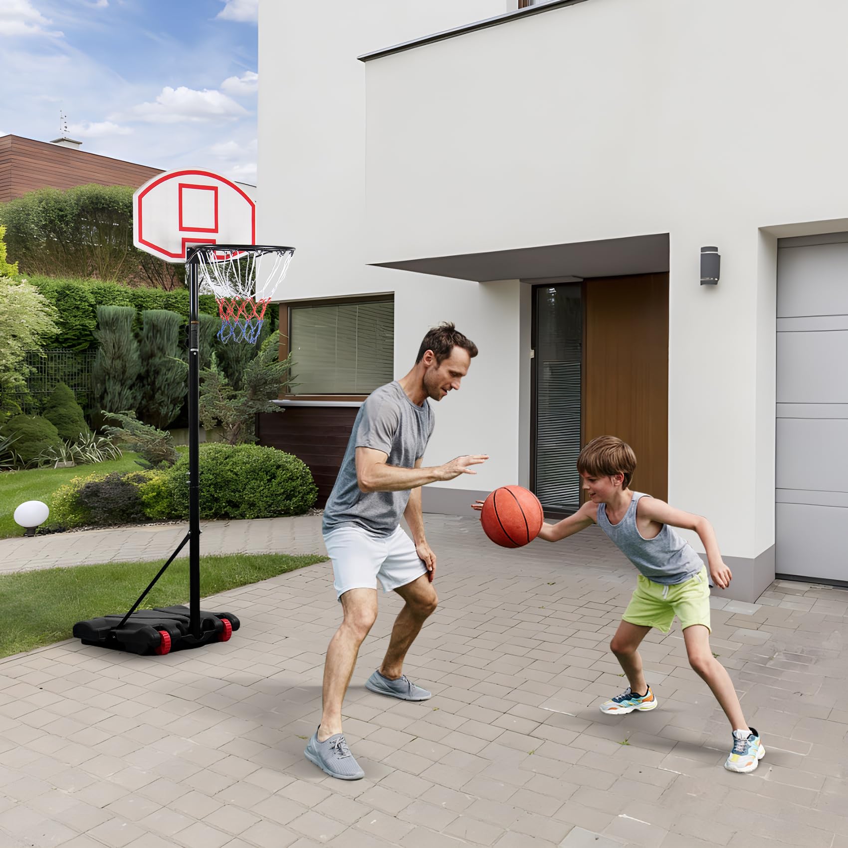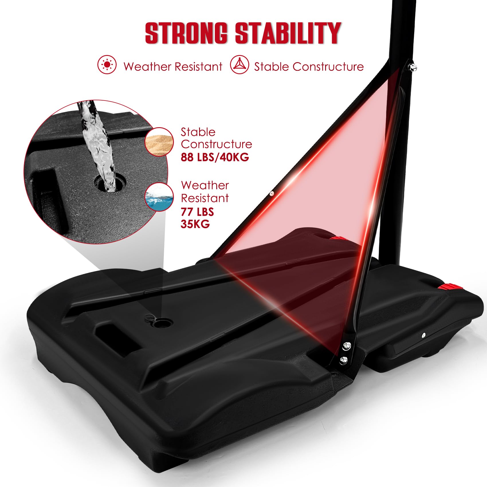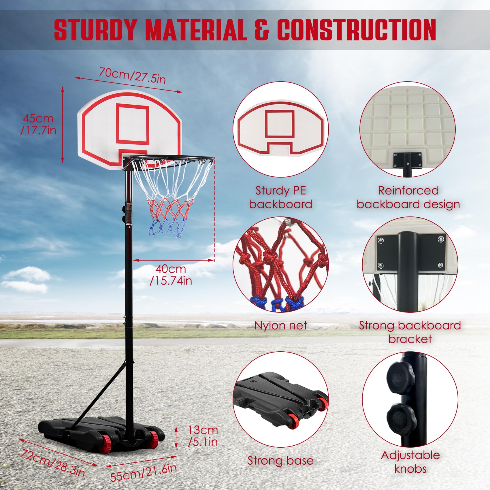 - 【More Stable & Structure】The base of portable basketball hoop measured 72x55cm/28.3x21.7in can be filled with water or sand, providing more stability and safety for kids when they play or make those big rebounds or shot. Constructed of sturdy steel pole and high density polyethylene backboard help you experience superior strength and durability with our basketball hoop. The weather-resistant nylon net ensures you can enjoy the game in any type of weather.