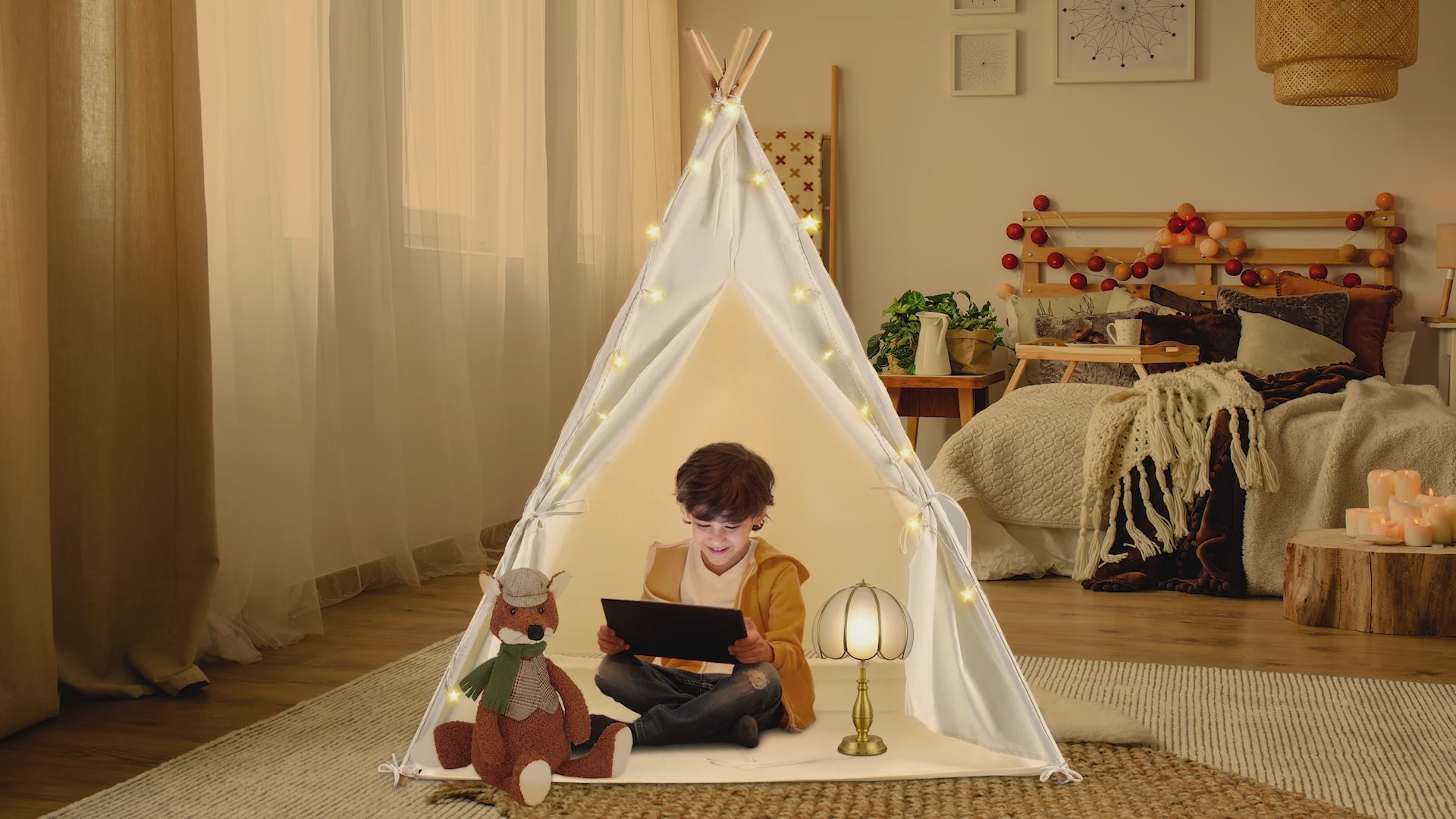 Are you looking for a kids' tent that sparks creativity and provides a safe and cozy play environment? Look no further! Our Teepee Tent with LED Fairy Lights is perfect for children ages 3-7. Made with pure cotton canvas, this portable tent offers a healthier and safer play space.